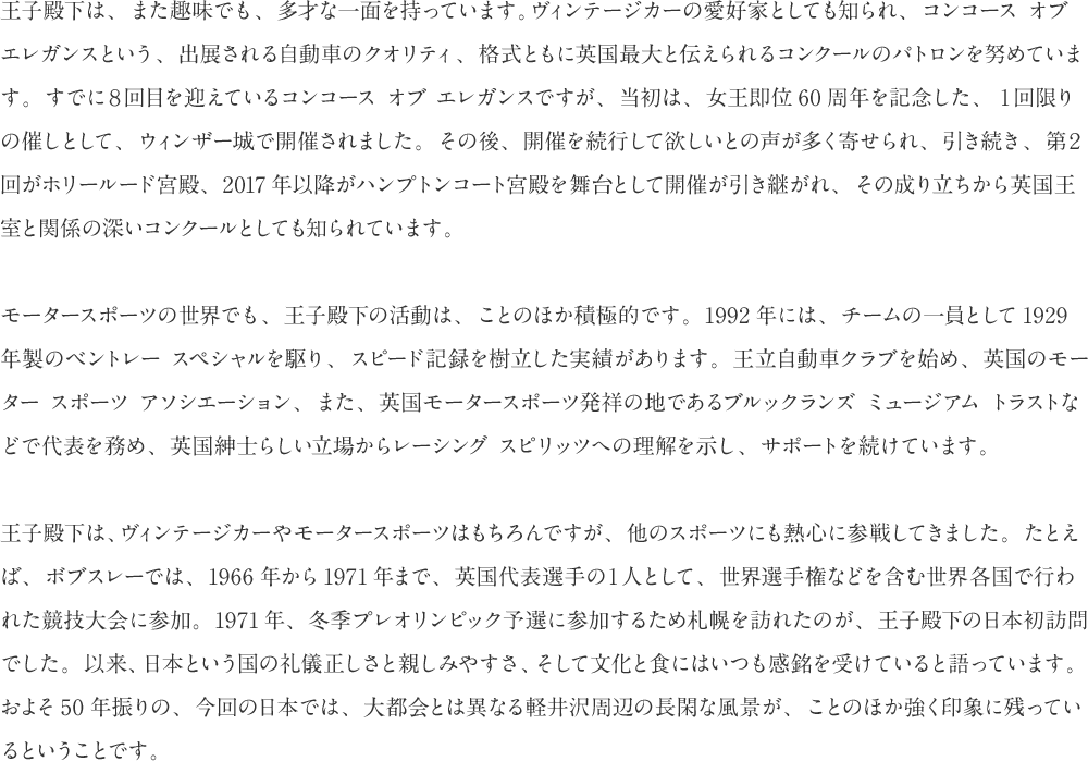 王子殿下は、ヴィンテージカーやモータースポーツはもちろんですが、他のスポーツにも熱心に参戦してきました。たとえば、ボブスレーでは、1966年から1971年まで、英国代表選手の1人として、世界選手権などを含む世界各国で行われた競技大会に参加。1971年、冬季プレオリンピック予選に参加するため札幌を訪れたのが、王子殿下の日本初訪問でした。以来、日本という国の礼儀正しさと親しみやすさ、そして文化と食にはいつも感銘を受けていると語っています。およそ50年振りの、今回の日本では、大都会とは異なる軽井沢周辺の長閑な風景が、ことのほか強く印象に残っているということです。