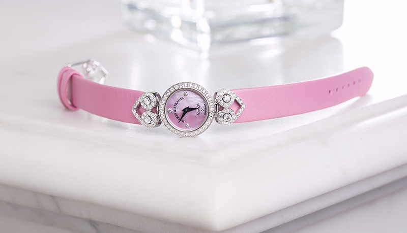 華やかで可憐なヴィクトリア コレクションに、小振りなケースと、シルクのような美しい光沢のサテンストラップを備えたダイヤモンドウォッチ、ミス ヴィクトリアがあります。ケースの上下に配された2つのハートは、バックス & ストラウスの膨大なアーカイブコレクションのなかから選び、ヴィクトリア朝時代のモチーフから着想し、現代の感性で甦らせました。使用するダイヤモンドには、もちろん、ラウンドブリリアントカットの理想的なプロポーションである“アイデアル カット”を施してあり、神秘的な光を放つマザー オブ パールの文字盤は、瑞々しさを引き立たせています。